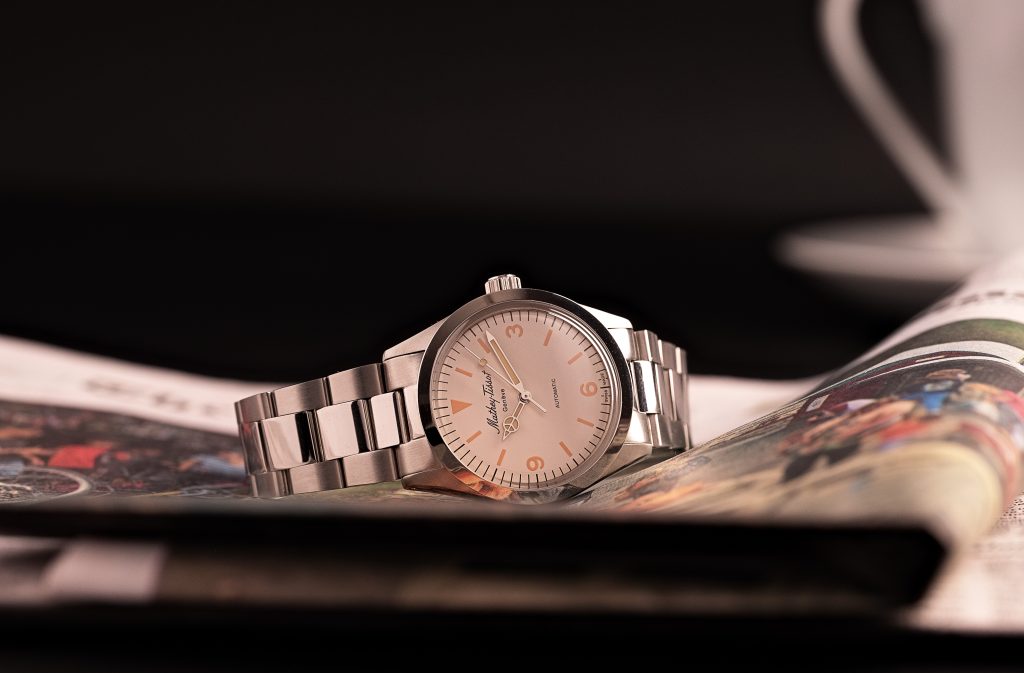 A black watch lying on its side, on a bed of small rocks. Rain drops are visible on the watch and rocks. Product photography created by Ottawa commercial photographer Seb Duper.